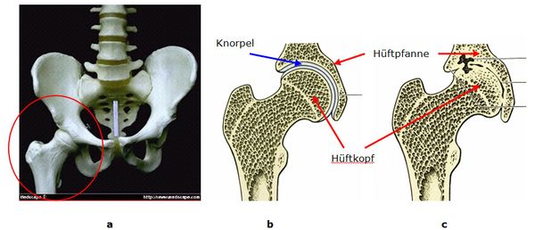 b Das Hüftgelenk ist ein Kugelgelenk und besteht aus den Komponenten Hüftpfanne und Hüftkopf. Die Hüftpfanne bildet eine kugelförmige Schale in der der Hüftkopf in allen Ebenen bewegt werden kann. Beide Knochenflächen sind mit Gelenkknorpel belegt.