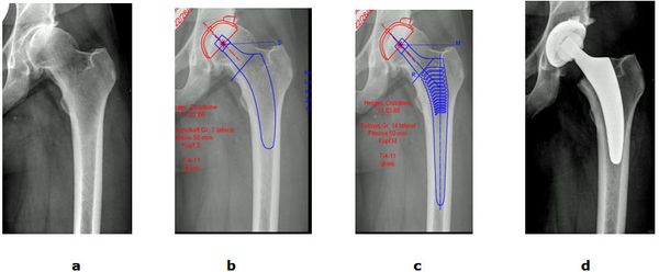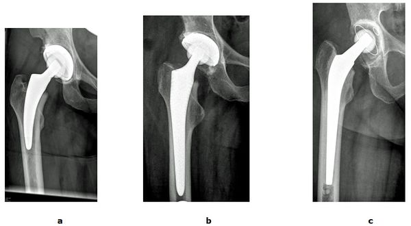 Abb.:1 a Kurzschaftprothese b Verankerung im Knochen c Röntgenbild